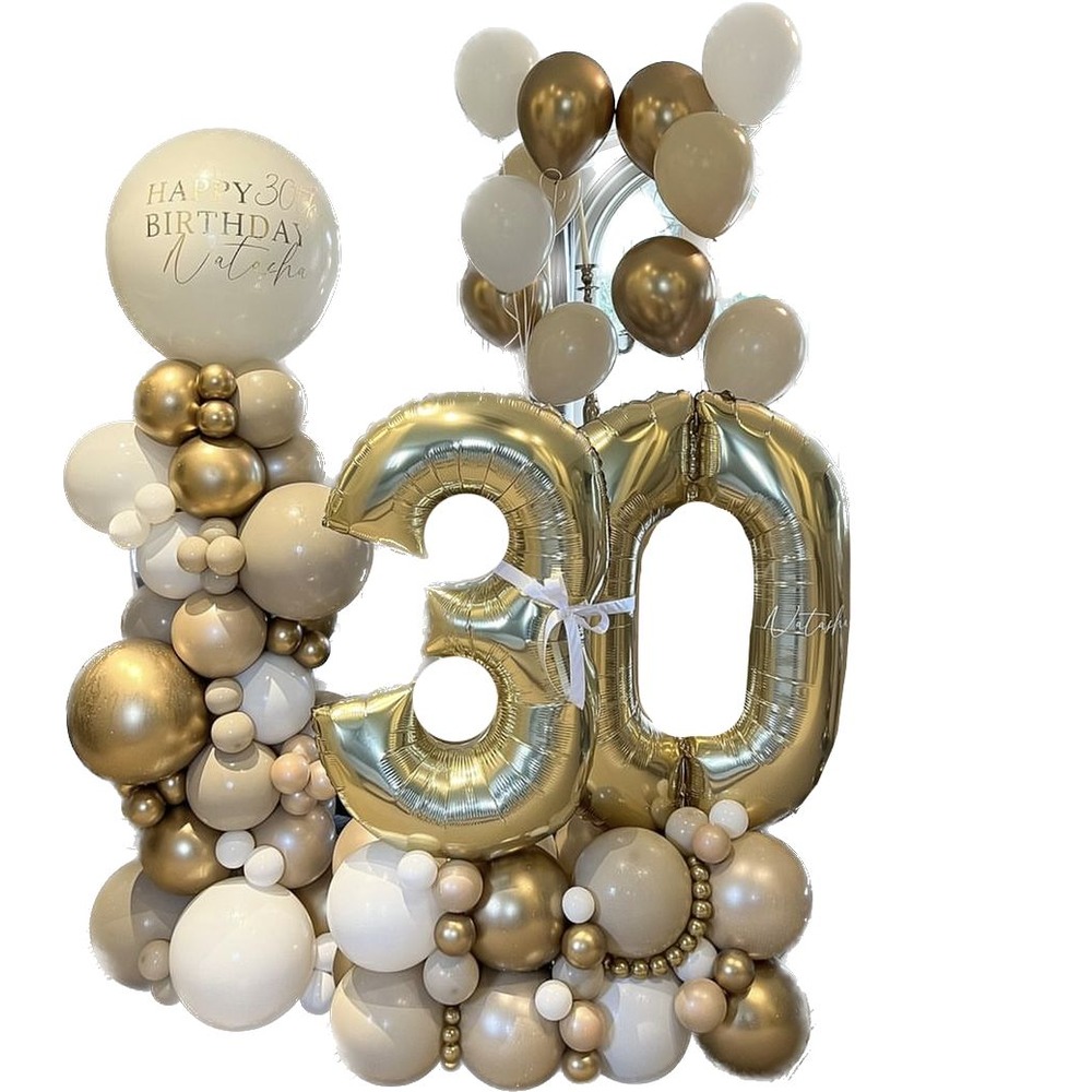 -40” Gold numbers placed on a wide balloon base filled with mini balloon clusters, decorated with a set of gold beige and white helium balloons.